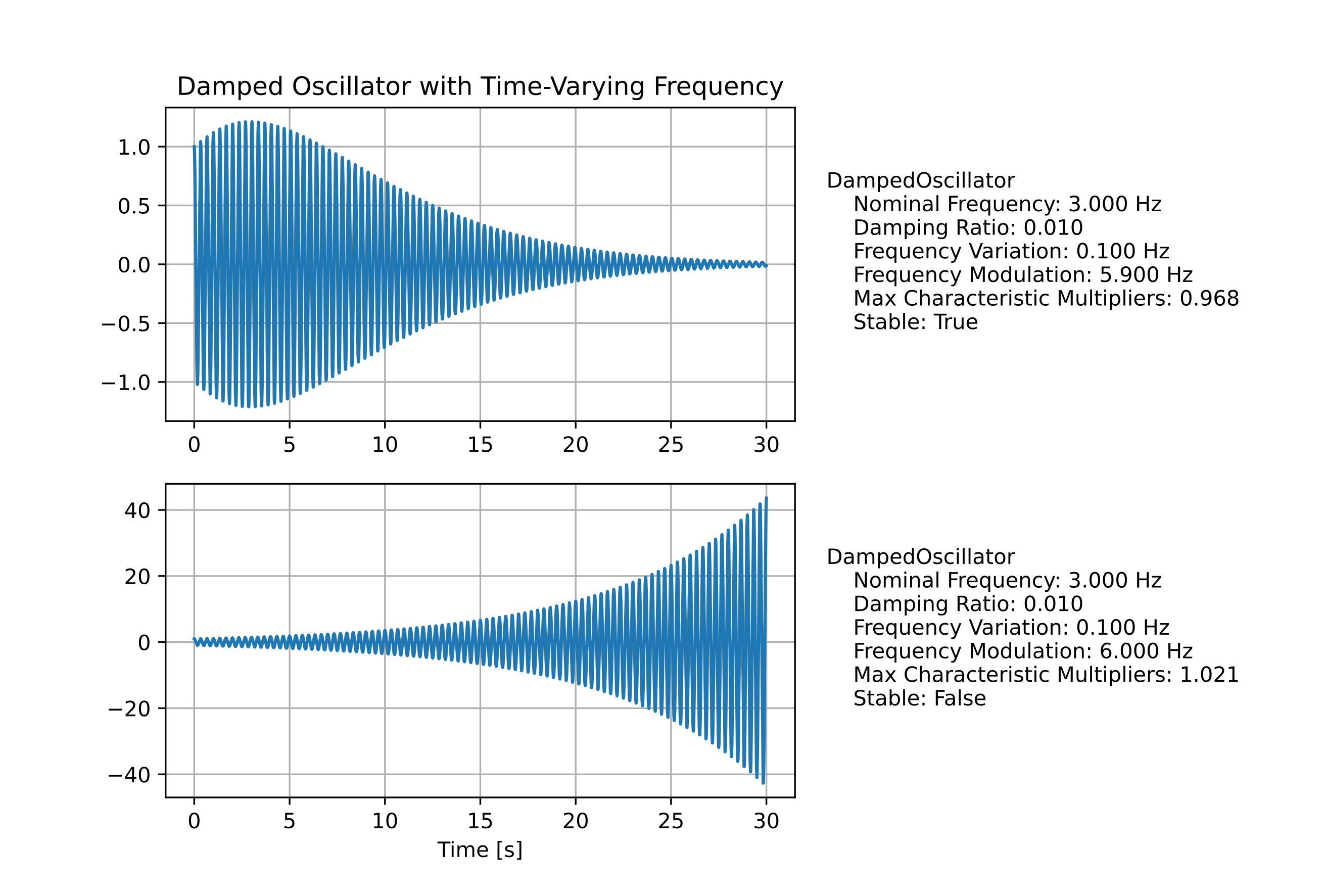 $$ \dot{\bm{x}}(t) = \begin{bmatrix} 0 & 1 \\ -\omega_n^2(t) & -2 \xi \omega_n(t) \end{bmatrix} \bm{x}(t) $$假设系统的固有频率是随时间周期变化的,即:$\omega_n = \omega_c + \omega_a \sin\omega_d t$,则该系统为本文所讨论的线性时变系统。